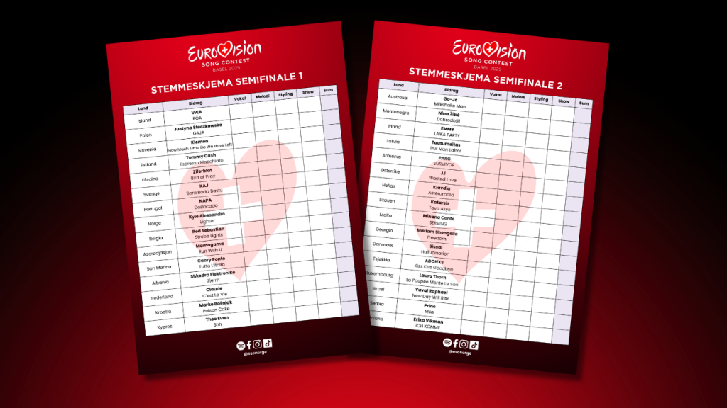 Syns du det er vanskelig å rangere dine favoritter, eller trenger du litt hjelp med å finne ut hvilke sanger som skal få dine stemmer? Fortvil ikke! Her får du stemmeskjema til Eurovision Song Contest 2025! Semifinalene av Eurovision Song Contest 2025 går av stabelen den 13. mai og 15. mai kl. 21.00. Finalen sendes […]